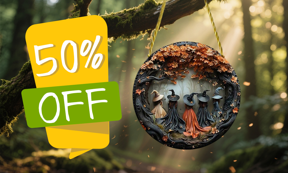 Hanging on her front door was a round wooden plaque, rich with color and shadow, and on it stood five witches in silhouette — each unique, each brimming with mystery.