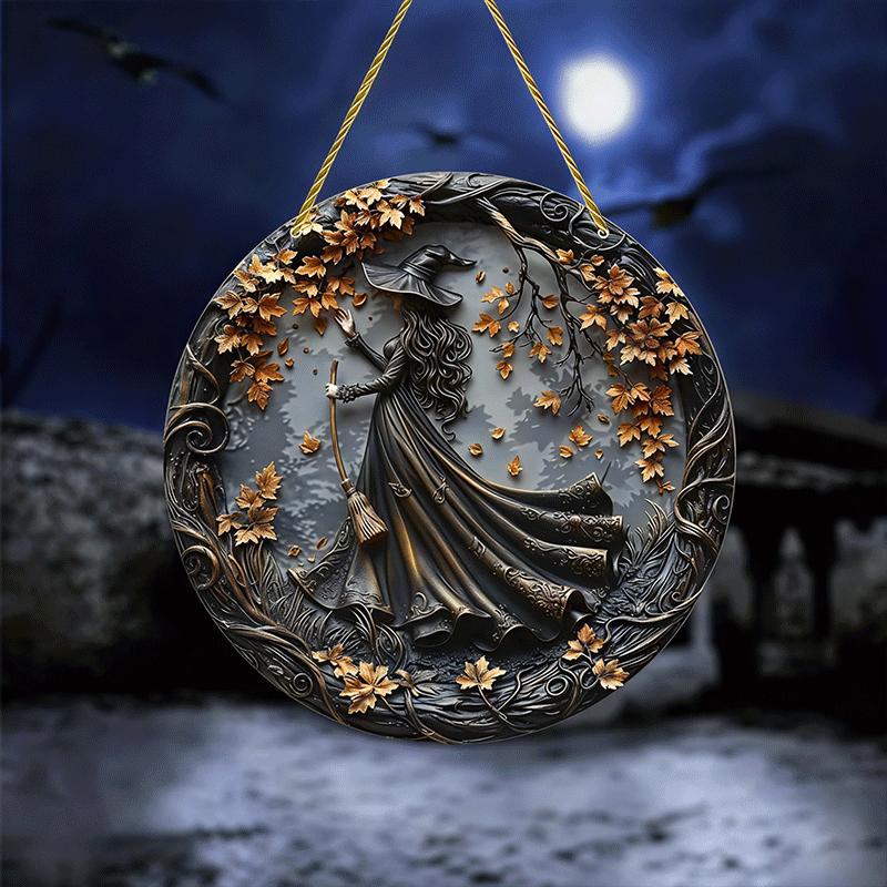 The circular frame becomes a portal. Those witches aren't static figures — they're storytellers. Guests pause, lean closer, and half-expect the leaves to rustle or the cauldron to hiss.